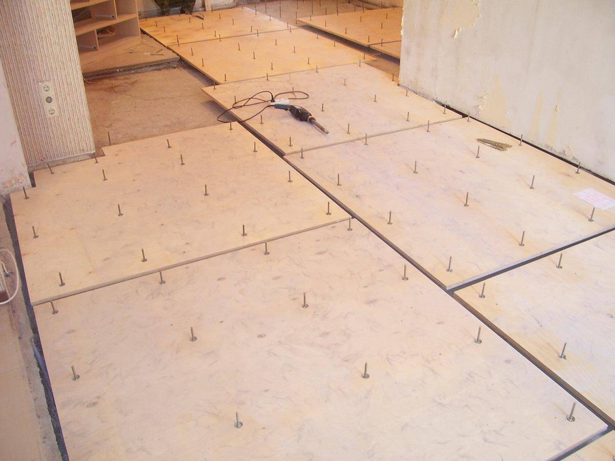 К подготовленному полу из деревянной доски фанера прикручивается саморезами по дереву, длина которых в три раза больше толщины фанерного листа. Перед закручиванием самореза под его шляпку сверлом фрезеруется потай. В результате шляпка должна будет оказаться чуть ниже плоскости листа. При необходимости её можно зашпаклевать и сделать поверхность абсолютно ровной.