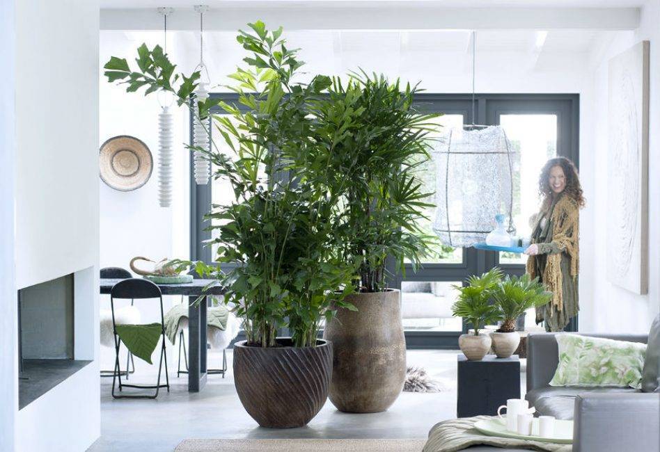 Высокие древовидные растения чудесно смотрятся в высоких кадках.
