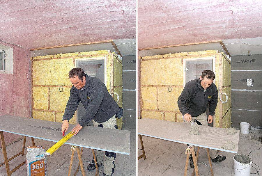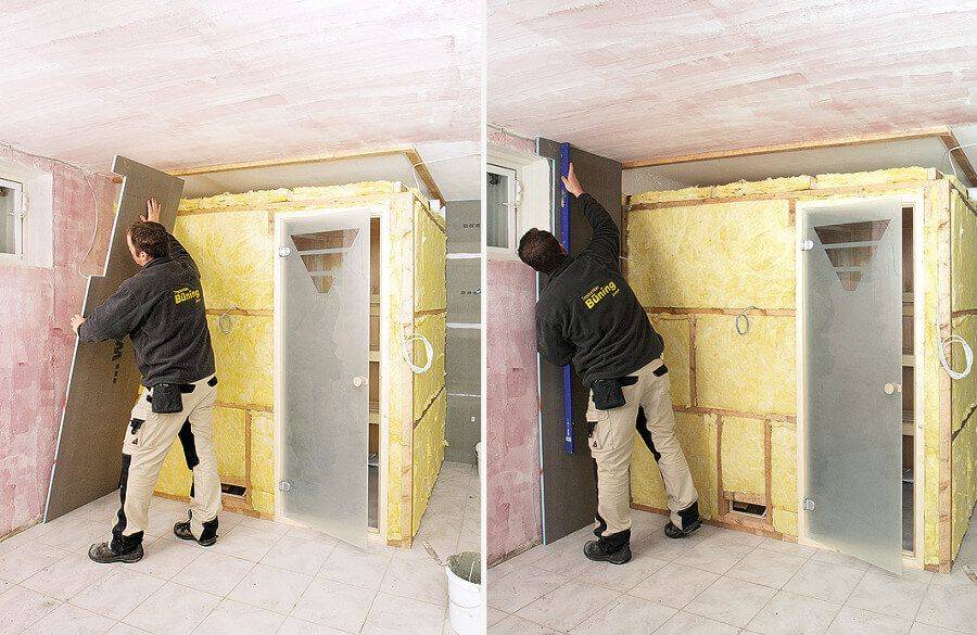 Душевую зону рядом с сауной облицовывают специальными влагостойкими плитами, прикручивая их к металлическим стойкам. Стыки проклеивают малярной тканевой лентой (серпянкой), чтобы выровнять основание под облицовку плиткой.