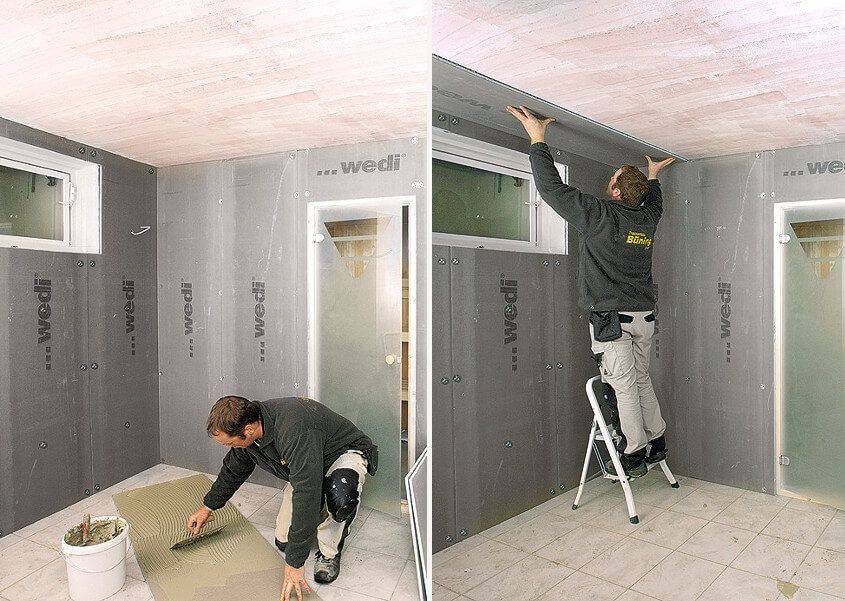 Еще до начала всех отделочных работ необходимо позаботиться о том, чтобы в помещении было сухо и комфортно. Для этого придется произвести полную гидроизоляцию. Чтобы влага не поступала из грунта, все поверхности необходимо будет тщательно высушить и покрыть гидроизолирующим материалом. Это может быть проникающая изоляция в виде специальной мастики, рулонная или другой ее тип