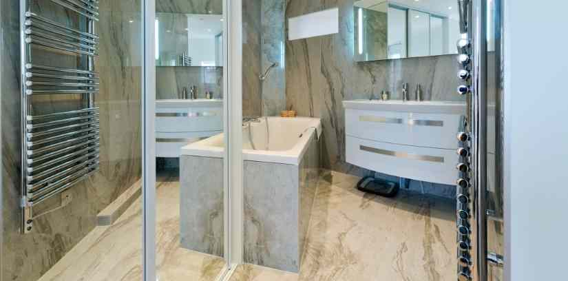 Покрытие обладает отличной влагонепроницаемостью, а при дополнительной гидроизоляции станет надежным барьером на пути воды. Бассейны, сауны, автомойки (в жилом помещении ванная, санузел, кухня) также могут быть декорированы покрытием под мрамор.