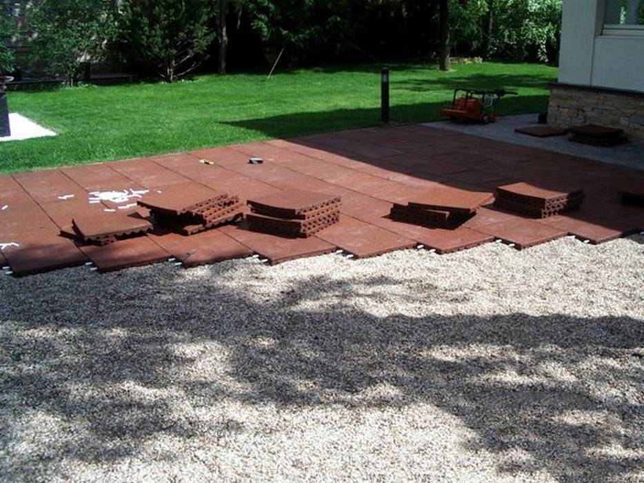 - На грунт укладывают плитку всухую, используя изделия большой толщины (40-50мм.). Для более надежной укладки рекомендуется верхний слой основания сделать из смеси песка и цемента.