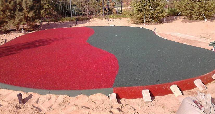 - Смесь для верхнего слоя содержит краску, либо вместо резиновой крошки применяются каучуковые гранулы, которые уже окрашены в нужный цвет.