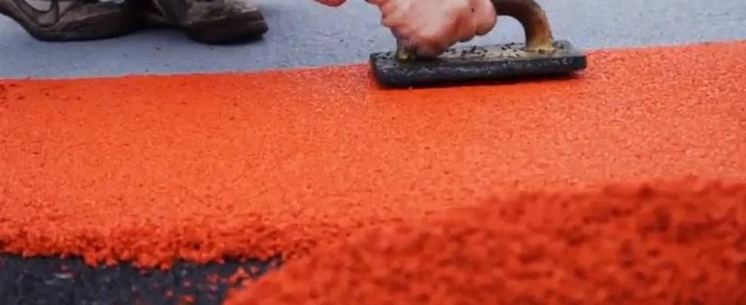 При укладке покрытия на больших площадях используют автоматические укладчики резиновой крошки. Они замешивают рабочий состав и равномерно распределяют его по поверхности с помощью направляющих. Они же выравнивают и укатывают покрытие, при этом достигается высокая точность толщины слоя.