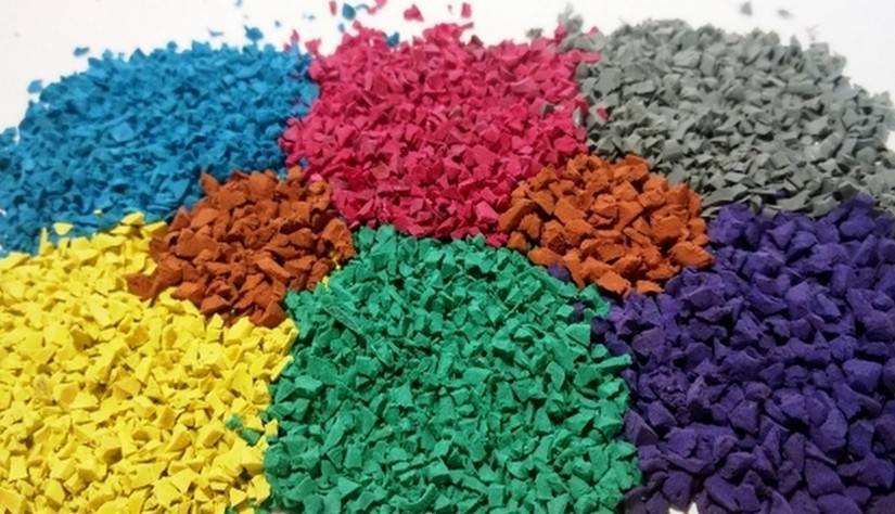 Независимо от типа технологии укладки и изготовления рабочей смеси, при создании покрытия потребуется резиновая крошка, клеевой состав и окрашивающие пигменты. Для обустройства полов в бассейнах, на спортивных площадках и беговых дорожках используется гранулят размером до 2 мм. Для детских и игровых площадок – среднефракционная крошка 2-5 мм.
