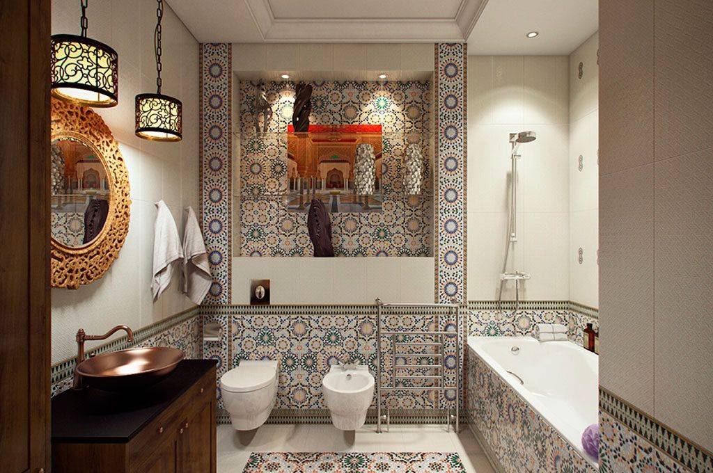 Для ванной в марокканском стиле нужно выбирать красочные бордюры