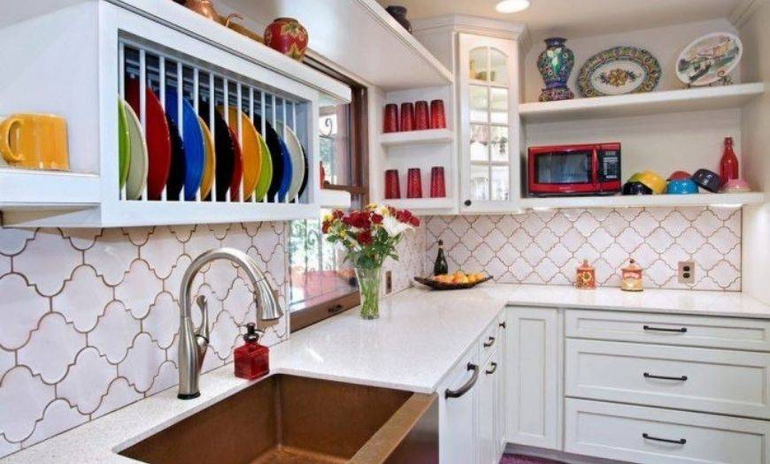 Для красного кухонного гарнитура подойдет матовая или глянцевая серая плитка. Она создаст необходимый контраст, слегка смягчив яркий дизайн мебели. С этой же целью для кухни белого цвета подбирают бирюзовую или изумрудную керамику. Бежевую мебель оживит кафель в цвете лайм. Для бежевой кухни также можно купить контрастную плитку с принтом в виде кофейных зерен. А цветная мозаика способна освежить любую кухню.