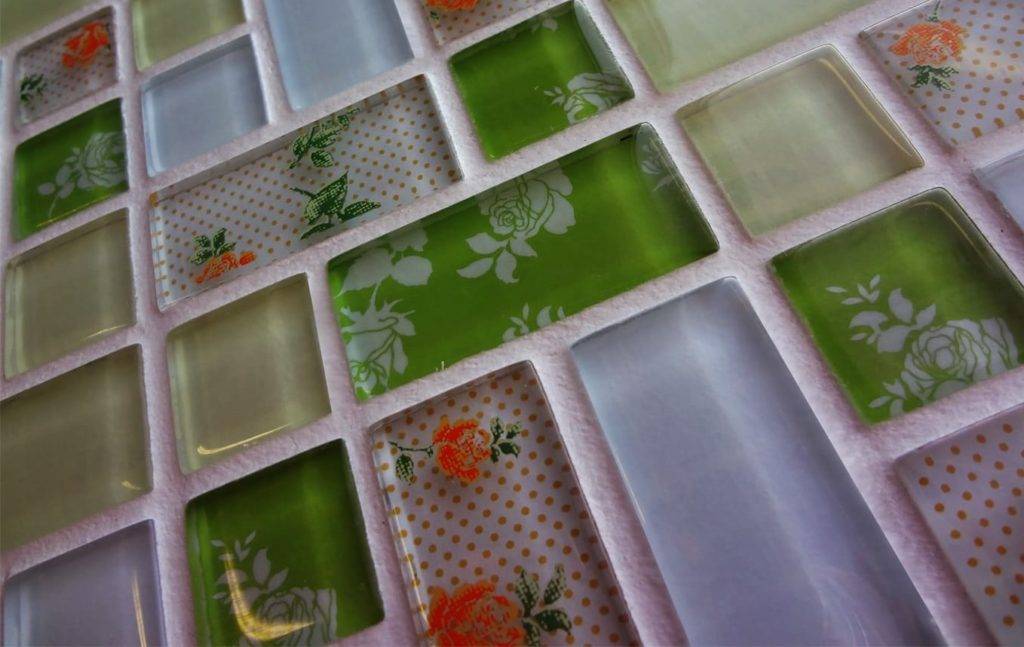 - Стекло. Прозрачные и полупрозрачные фрагменты привлекают красивым декоративным эффектом, переливаясь и отражая свет, создают интересный антураж. Изготовляются из кварцевого песка белого цвета с добавлением пигментов, чтобы достичь мерцания. Часто используются вкрапления перламутра или крошки полудрагоценных камней – авантюрина, перламутра и пр. Стеклянная основа обрела популярность и из-за практичного момента – этот материал отличается настолько низкой пористостью, что на его поверхности не могут размножаться микробы. Это большой гигиенический плюс.