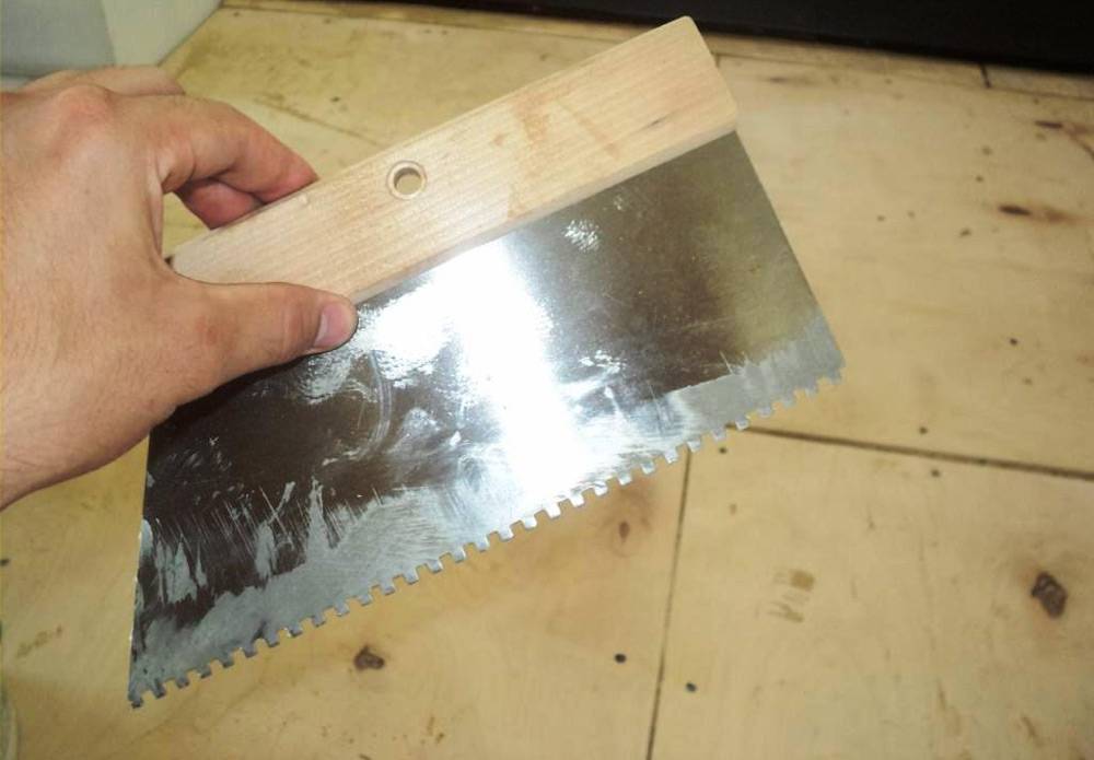 Каждый ряд проверяется на ровность при помощи строительного уровня. Клей надо наносить сначала на поверхность пола (не больше, чем на один квадратный метр), а потом на изнаночную сторону плитки при помощи небольшого зубчатого шпателя. Слой клея должен быть равномерным и не очень толстым.