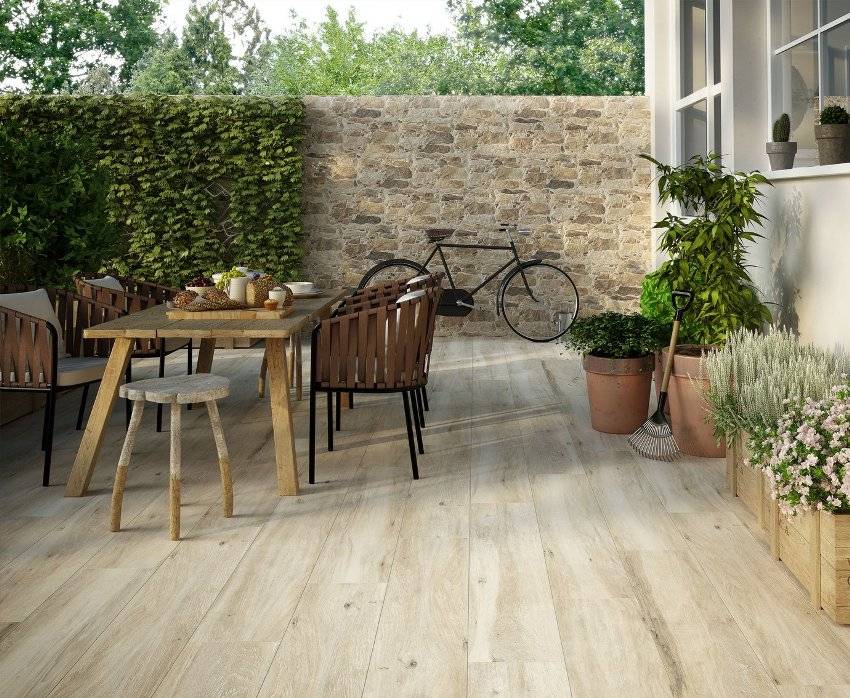 Плитка толщиной 2 см немного тоньше крупноформатного керамогранита — ее можно укладывать снаружи без использования клея. Среди них также можно найти доски с имитацией — для тех, кто хочет иметь террасу, внешне похожую на деревянную, но при этом безопасную в использовании и не требующую особых мер.