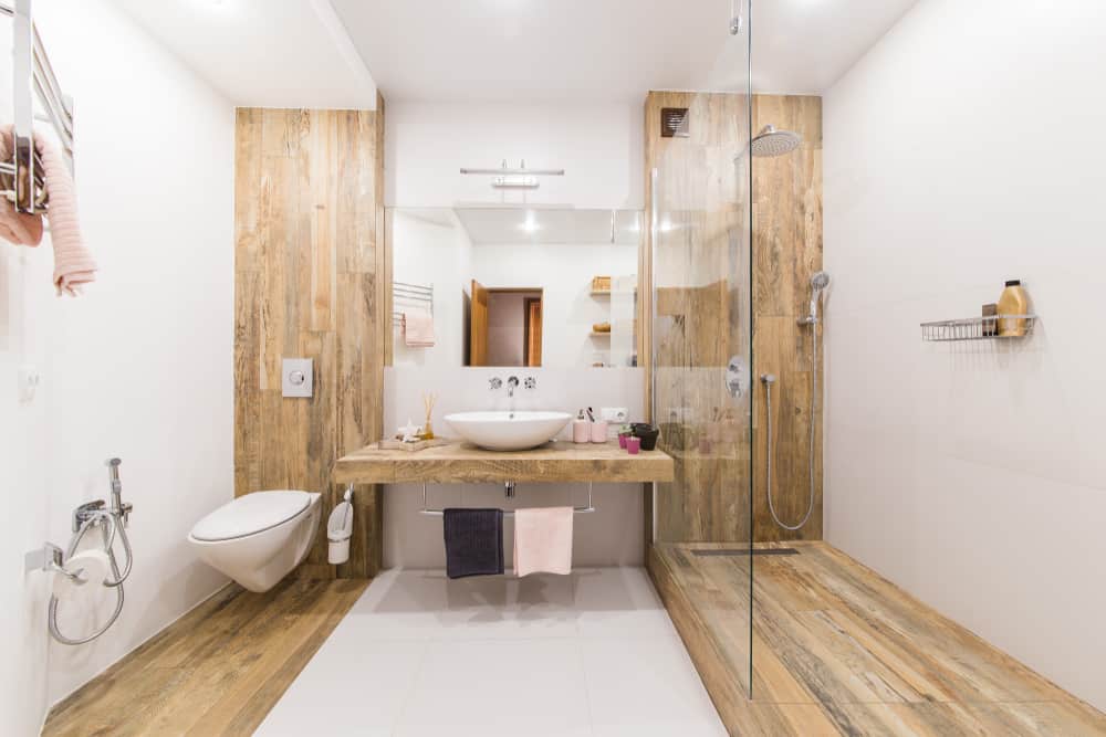 Хорошим решением является укладка плитки под дерево в ванной. Материал обладает повышенной влагостойкостью, что создаст дополнительную изоляцию помещению. Здесь целесообразно отдать предпочтение изделиям класса износостойкости PEI II, которые имеют рельефную, шероховатую фактуру с матовым оттенком, что также снижает риск скольжения.