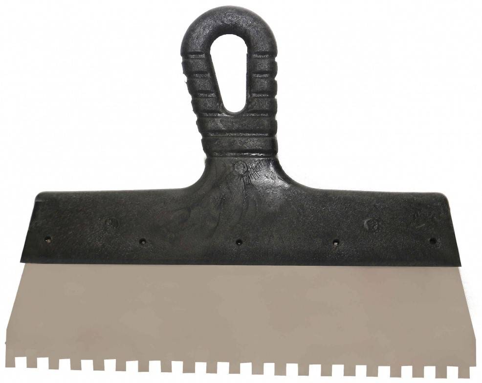 Зубчатый шпатель применяется для нанесения клея или мастики, когда производится укладка гипсовой плитки, кафеля, многих других стеновых и напольных покрытий. Форму его лучше выбирать в виде прямоугольной трапеции, шаг зубьев – 5/7 мм, глубина — 3 мм. Точные характеристики подбираются в зависимости от свойств клея и сухих смесей для выравнивания полов или стен, примененных для выравнивания поверхности.