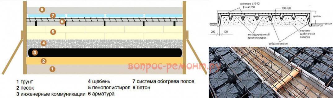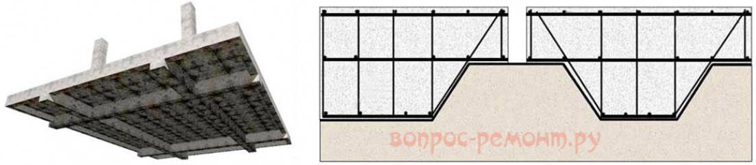 В сущности, это плитно-ленточный фундамент с дополнительными частыми мелкими ребрами жесткости. Все достоинства плиты с лентой (см. далее) и все ограничения для нее действительны и в данном случае. Изюминка конструкции в том, что весь короб заливается на пластиковую форму, вдавленную в мощную песчано-гравийную подушку; она же является гидро- и теплоизоляцией. Точность выполнения нижней поверхности плиты по форме обеспечивает полное соблюдение расчетных параметров. Дополнительные ребра жесткости и тоннели для коммуникаций формируются несъемной опалубкой из стекломагнезитовых плит, слева внизу на рис. Это позволяет почти вдвое снизить материалоемкость плиты. Однако расчет и постройка такого фундамента требуют профессиональной работы достаточно высокого уровня или точного повторения типовых образцов.
