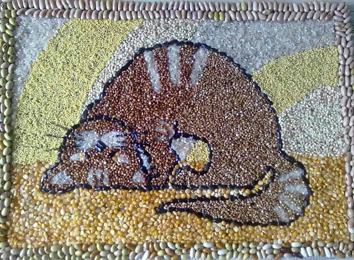 Но сначала крупу нужно подготовить. Для этого ее перебирают, удалив примеси. Если она «чистая», то этого можно не делать, а сразу приступать ко второму этапу. Если в вашем панно будет использоваться несвойственной крупе цвет, ее нужно покрасить. Для этого берется светлая крупа, например, рисовая. Ее кладут в техническую посудину, добавляют гуашь или акриловую краску, тщательно перемешивают. Затем высыпают на бумагу в один слой. Дают подсохнуть и используют для творчества.