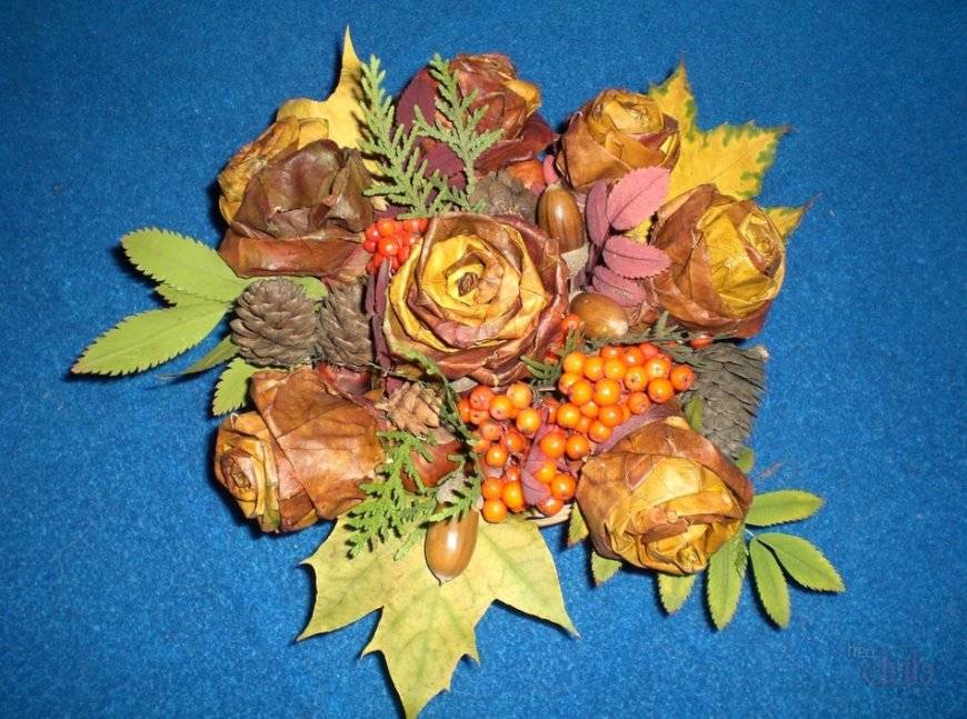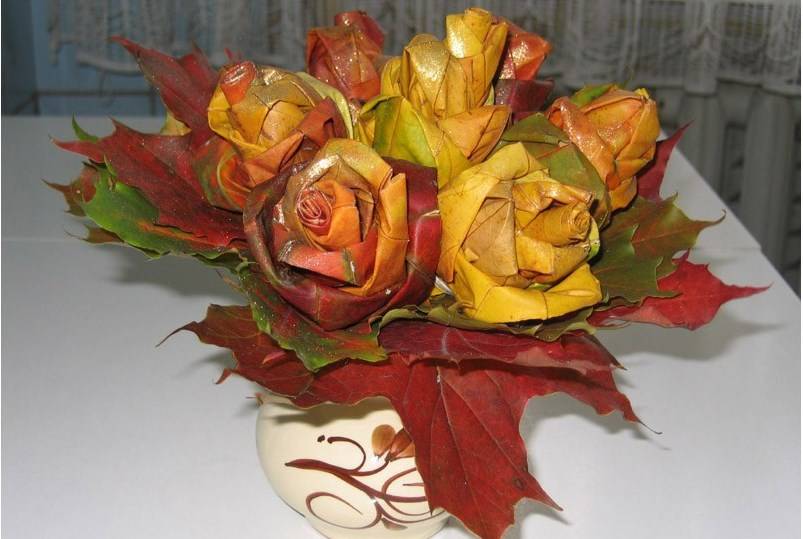 Особой популярностью для изготовления букетов пользуются листья клёна. Сделать цветы из них смогут даже дети. Для этого листья складывают пополам. Из первого листочка скручивается трубочка, на которую крепится каждый следующий листок. В конечном результате получается цветок, напоминающий распускающийся бутон розы. Чтобы придать ему прочность, в области основания черешки с листьями обматывают ниткой.