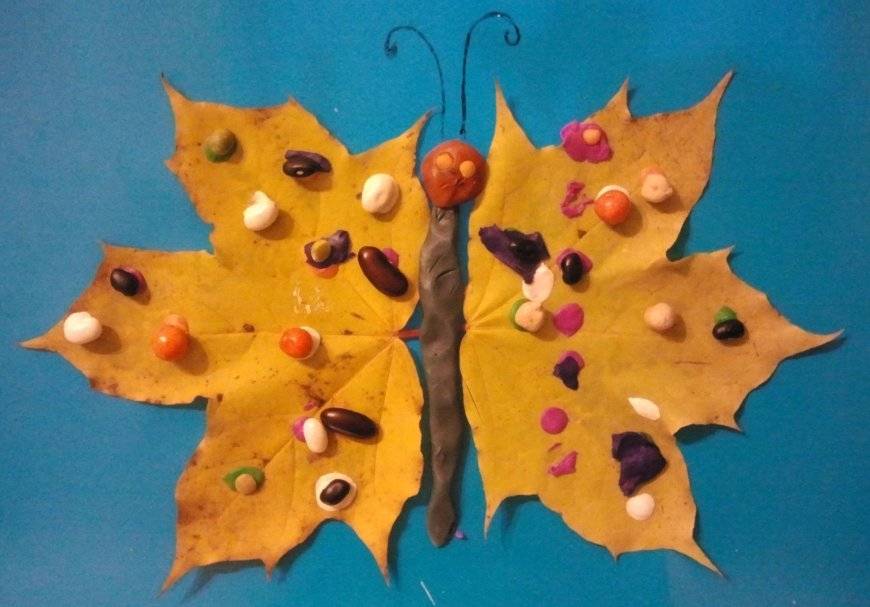 В такой аппликации участвуют не только листья или природный материал, здесь присутствует и пластилин