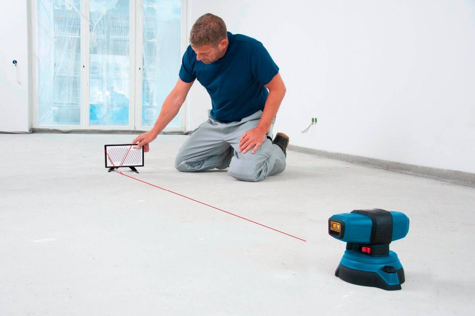 Первым шагом следует определить уровень перепадов по высоте на всей площади основания. Наилучшим прибором для определения разницы будет лазерный осепостроитель, который даст наиболее точный результат.