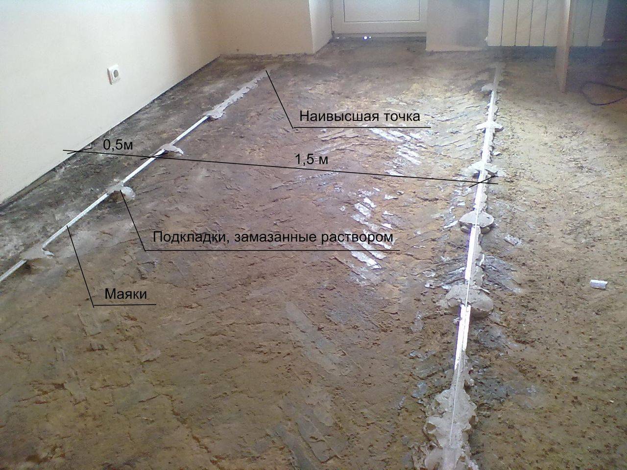 - материал (бетонная стяжка, наливные полы, черновой, фанера, плиты);