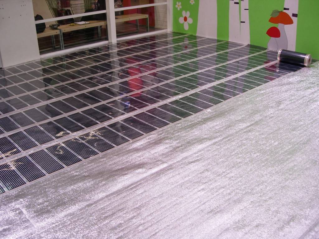 При монтаже такого обогрева сама поверхность существующего пола выступает как основание теплого пола. На него укладывается гидроизоляции (не всегда, только в случае необходимости), а поверх – слой теплоизолирующего отражающего материала. Именно это и будет подложка под пленочный теплый пол. На эту подложку укладывают ИК пленку, отдельные листы которой соединяются между собой с соблюдением полярности, а затем подключаются к сети.