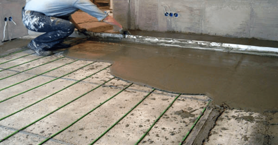 Подготовка пола производится так же, как при устройстве обычной стяжки – обязательно снимается частично разрушенное и потерявшее прочность старое покрытие, фрагменты прежней стяжки, убирается весь мусор и пыль. С учетом того, что в стяжке будет проложен кабель, необходимо как можно внимательнее отнестись к гидроизоляции перекрытия (чернового пола) и выполнить теплоизоляцию под стяжку.