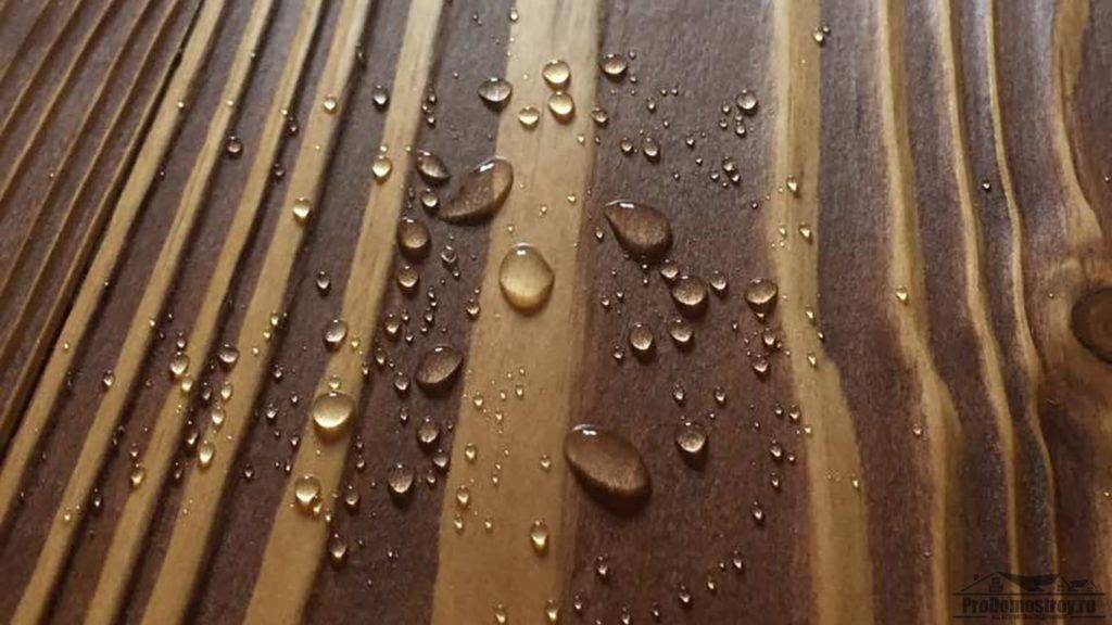 - Состав не только защищает от намокания, но и закрывает влагу внутри. Поэтому дерево не подвергается чрезмерному высыханию. Намокание и высыхание древесины приводит к изменению объема конструкций, а влагостойкая пропитка защищает от появления зазоров, щелей, скручивания.