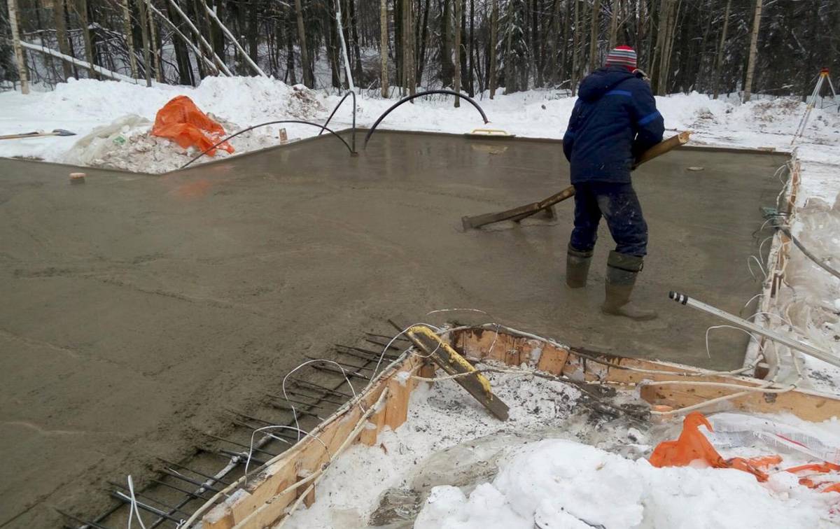 Бетон схватится еще в момент заливки, а дальше его можно просто прикрыть тканью, и ему не будут страшны никакие перепады температур.