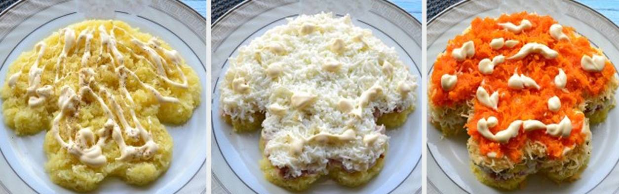 Следующими слоями идут нарезанные маринованные шампиньоны с майонезом, и тертая отварная морковка.