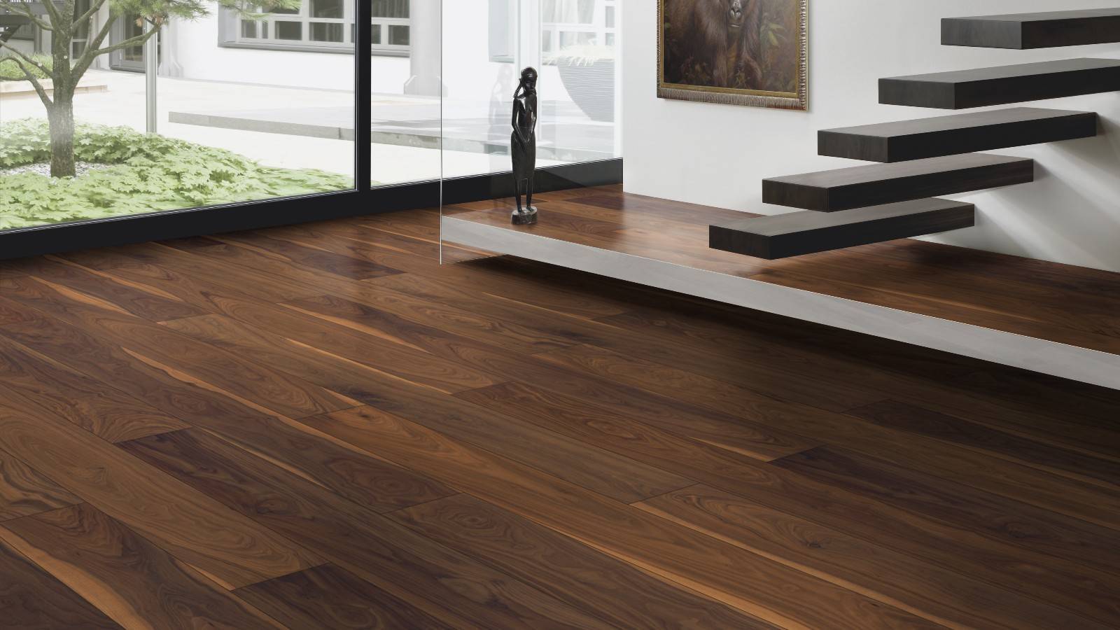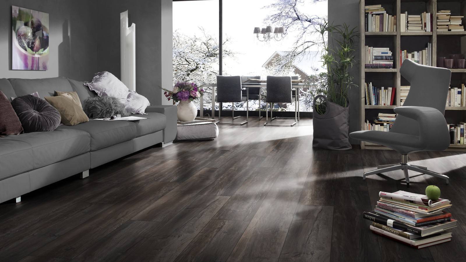 Серый не всегда должен быть мягким и легким, он может быть темным и угрюмым. Темно-серый может добавить настоящую драму в комнату, играя оттенками цвета на темном фоне. Таким образом темные полы или стены могут иметь действительно впечатляющий внешний вид. Даже садоводы любят использовать серый цвет в качестве фона в саду, так как он действительно может выделять зеленые растения. Поэтому, если вы любите зеленые аксессуары в помещении, то темно-серый ламинат может стать прекрасным фоном для них.