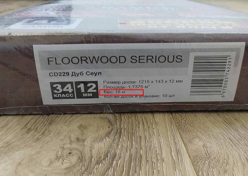 Напрямую зависит от досок. В среднем от 15 до 17 кг. Чем толще доска, тем она больше весит. Обычно производители указывают его на торце пачки. Этот показатель они высчитывают, учитывая сколько квадратов в упаковке ламината и плотность материала.
