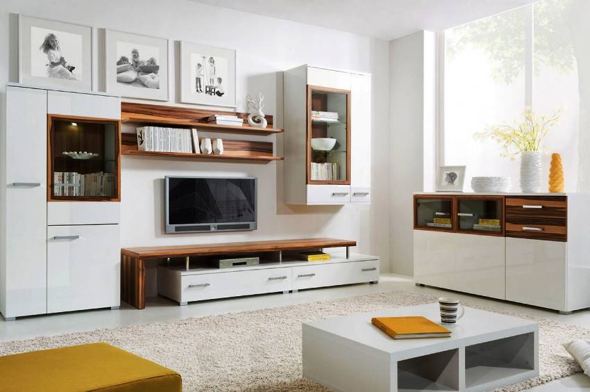 В стандартном варианте прямой линейной мебели-горки в гостиную присутствуют несколько шкафов, закрытые и открытые полки, тумбочка для телевизора, являющаяся центральным элементом гарнитура. Все остальные его составляющие располагаются симметрично. Сначала устанавливаются высокие элементы. Остальные размещаются ближе к краям по мере снижения. Такая расстановка делает гостиную комнату визуально выше.