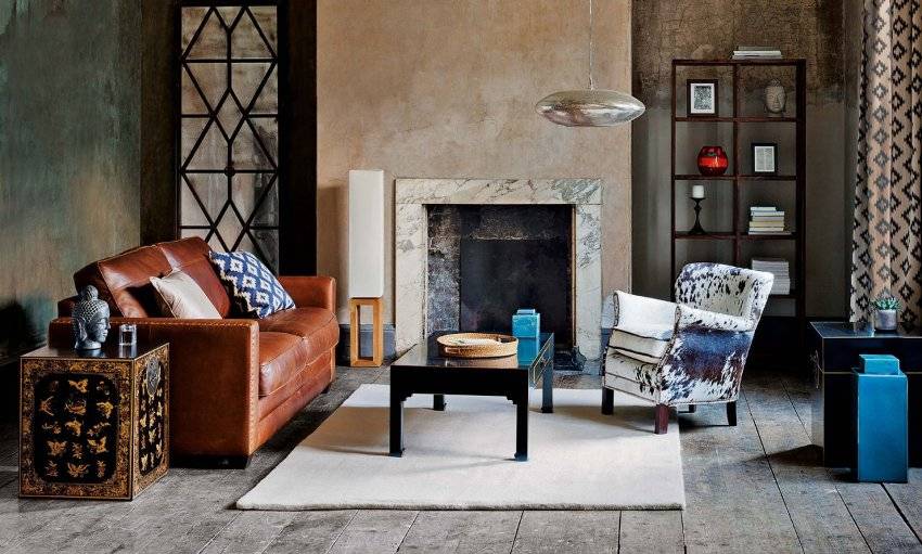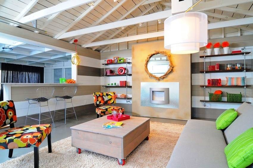 Из предметов, которые чаще других можно увидеть в таких интерьерах, можно отметить камин, барную стойку, большое кресло или кресло-качалку, а также большие тумбы и полки, на которых можно хранить все детали, создающие домашнюю атмосферу.