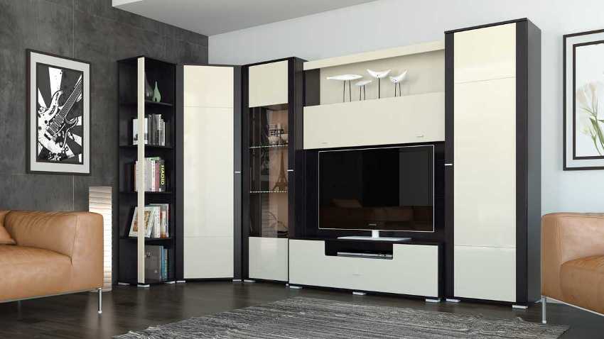 В качестве углового модуля выступает платяной шкаф, по бокам которого размещаются низкие тумбы или закрытые напольные ящики, а над ними – открытые полки. Существует и другое исполнение угловой конструкции, где в углу располагается невысокая тумба с телевизором. Над ней навешиваются открытые полки. С обеих сторон устанавливаются стеллажи. Угловая стенка для гостиной также предусматривает асимметричное расположение секций, благодаря чему можно создать уникальную мебельную композицию.