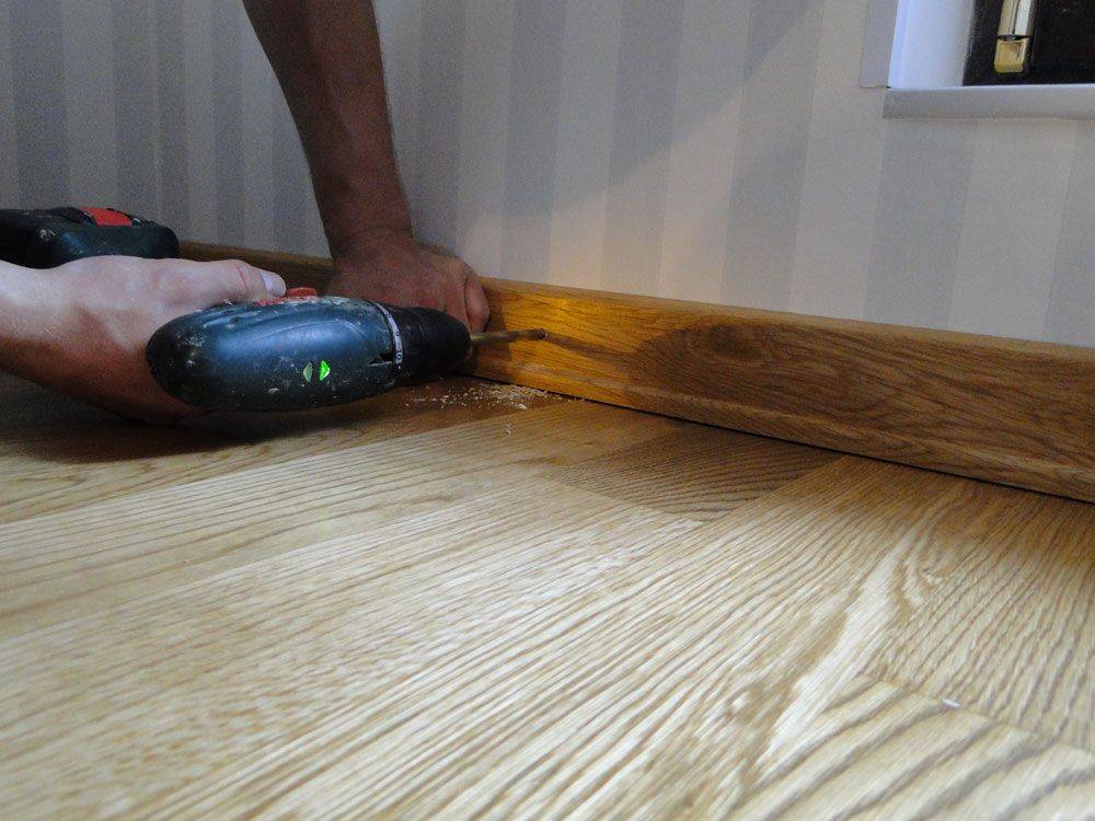 Если выполняется монтаж деревянного плинтуса, то второй способ неуместен. Работать нужно хорошим инструментом. Вместо саморезов целесообразно использовать паркетные шпильки, которые смотрятся намного эстетичнее. И в этом случае плинтус прибивается к полу.