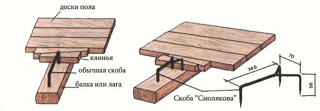 Аналогичным образом производится стяжка доски пола при помощи скоб, также служащих в качестве фиксаторов и упоров при монтаже. Скоба в этом случае вбивается в расположенные рядом доски, обеспечивая их плотное прилегание друг к другу. Чем более глубоко будет «утоплена» скоба, тем сильнее будет эффект стяжки.