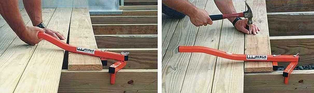 Но лучше всего пользоваться специальным приспособлением для стяжки досок пола, как на картинках ниже: