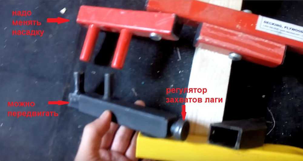 Лаги могут быть различной толщины. Чтобы была возможность «упираться» в них, есть сменные насадки. Упор снимается легко: надо вынуть две шпильки, которые фиксируют крепежные болты. Тем не менее, набор состоит из трех-четырех насадок, так что вариантов не так и много.