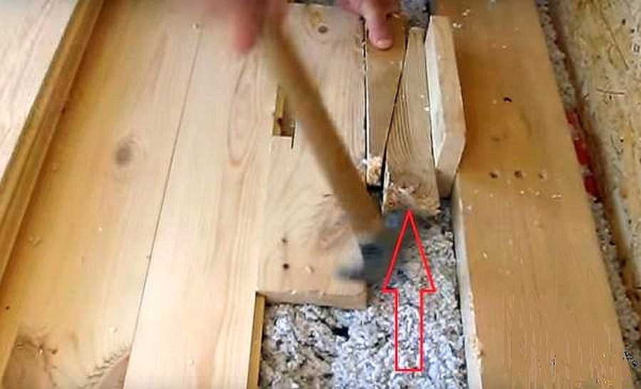 К устанавливаемой доске прикладывают кусок «для подбоя» с окошком, через которое можно будет закрутить саморез. Для того чтобы можно было стягивать половицы, между опорой и клиньями вставляют обрезки. Сначала нужны длинные куски, затем все меньше. Вся конструкция собирается так, чтобы клинья встали таким образом, чтобы подбив их, можно было сплотить доски.