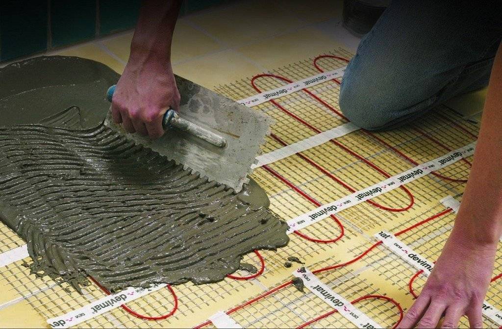 Для электрического теплого пола с использованием кабелей толщина должна быть равна 2,5–3 сантиметра, для пленочного типа нагревателя – 1–1,5 сантиметра.