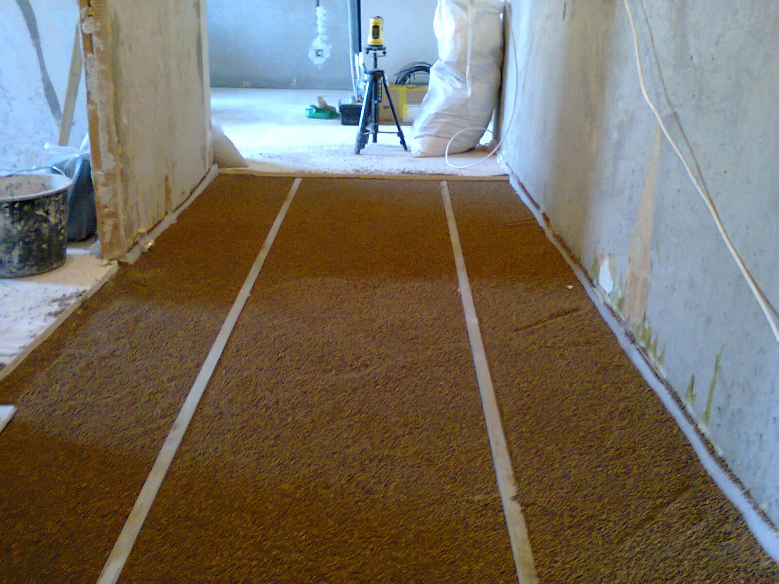 Сыпучий материал, в роли которого выступает керамзит, нужен для ровненькой поверхности, и для тепло- и шумоизоляции. Керамзит насыпается на пленку и разравнивается по отмеченной разметке правилом. В качестве засыпного материала может употребляться кремнеземный или кварцевый песок, вспученный перлитовый песок, тонкодисперсный шлак или отсев производства керамзита. Все эти материалы обладают низкой гигроскопичностью, практически не оседают, имеют высшую пористость и неплохую сыпучесть.