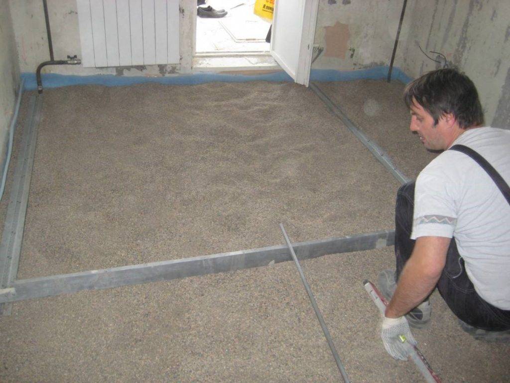 Засыпку используют для создания идеально ровного пола. Вначале устанавливают уровень поднятия основания. Если слой из бетона составляет 10-20 мм, то достаточно будет выложить слой засыпки в 30-40 мм.
