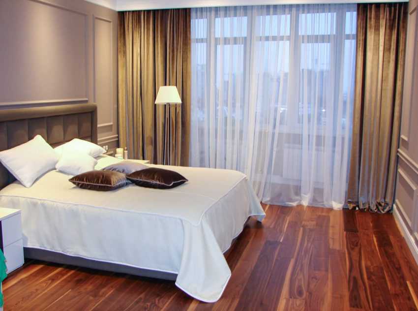 В интерьере спальни светлый пол добавит уюта в сочетании с белым или темно-коричневым плинтусом, пастельными обоями и легким тюлем. Из материалов подойдет ламинат и паркет для приятных ощущений ногами.
