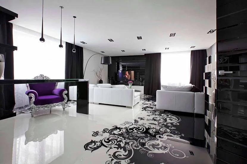 Чтобы на глянцевом полу не проявилась нежелательная желтизна, мебель (включая обивку) выбирают особенно внимательно, предпочитая холодные сероватые оттенки. Дизайнеры советуют избегать мебели и аксессуаров насыщенных цветов — черного, шоколадного, цвета мореного дуба или красного дерева, а также заменить лампы на дневные или галогенные.