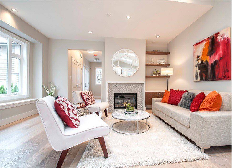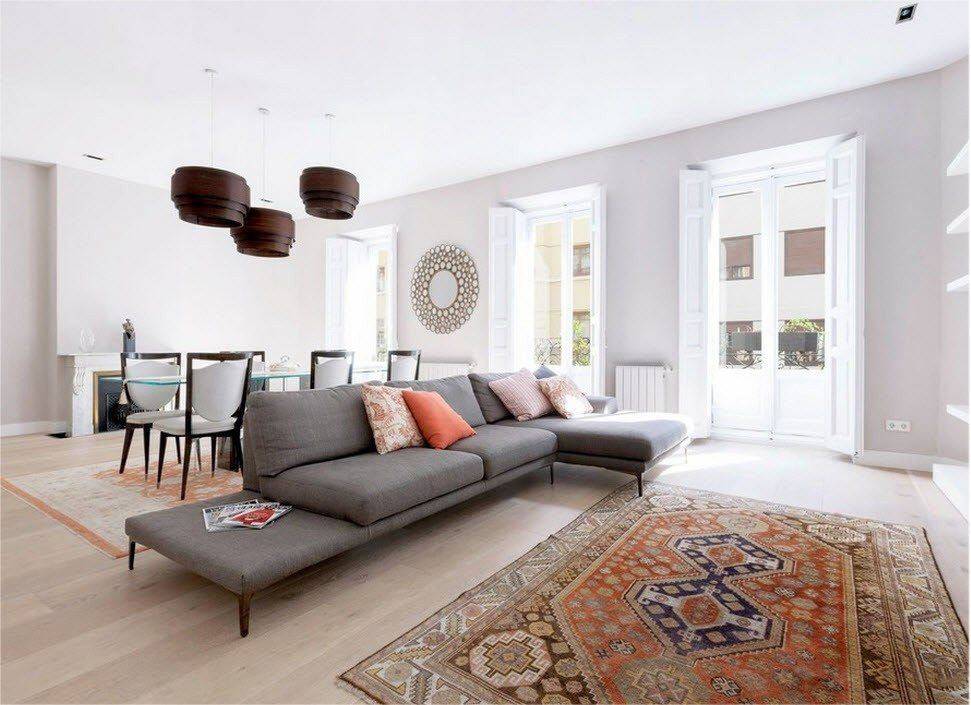 Светлые оттенки подчеркнут размеры большого зала и визуально увеличит маленькую гостиную. При зонировании комнаты также можно сделать переход цвета пола.