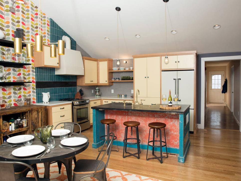 В кухне интересно смотрится пол, выложенный мозаикой из разноцветной мелкой плитки. Его можно отзеркалить на фартук над рабочей поверхностью. Остальные стены делай одного нейтрального бежевого или молочного оттенка.