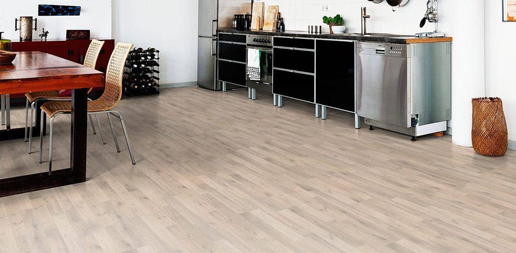 - Кухня. Является сложным пространством с точки зрения выбора класса износостойкости материала. Внешний вид подбирайте под общий дизайн. На кухне высокая влажность, есть вероятность попадания жирных капель на пол. Поэтому отлично подойдет материал, обладающий высокой степенью устойчивости к негативному влиянию перечисленных факторов.