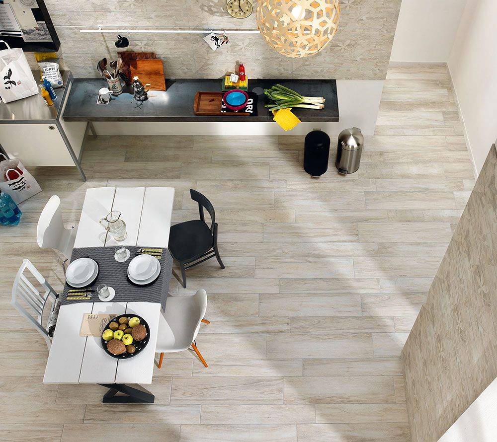 В кухню подойдет плитка, линолеум, ламинат в зоне обеденного стола белого, бежевого, светло-кофейного, серого цвета. Плитку нужно выбирать нескользкую гладкую или матовую, можно с дизайном, а ламинат – влагоустойчивым.
