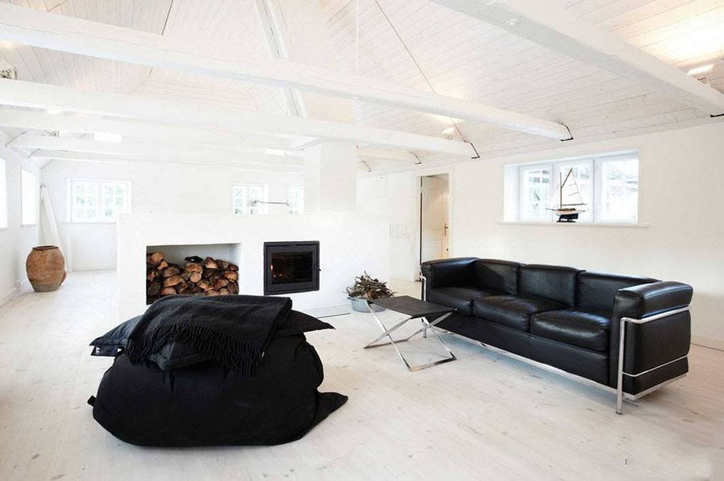 Белый цвет – основополагающий, на его фоне все эти коммуникации и нарочито грубые элементы смотрятся выигрышно и интересно! Сделайте акцент на фактуры: беленая кирпичная кладка, рельефная штукатурка, небрежно окрашенные доски! Можно поиграть на контрастах, добавив черные и коричневые акценты.