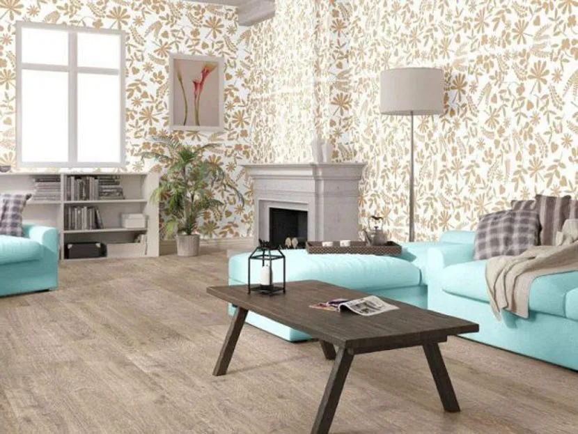 Под однотонный пол подбирают обои с растительным или абстрактным орнаментом. Белоснежный пол требует обоев голубого, фисташкового, лавандового, розового цвета. Хорошим дополнением к белому дереву станут обои природных (песочного, карамельного, корицы) оттенков.