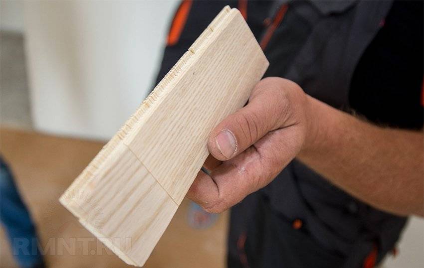 Если профиль торца имеет обычное, а не замковое соединение, то сплачивание доски, чтобы не повредить шип, проводят через специальную накладку.
