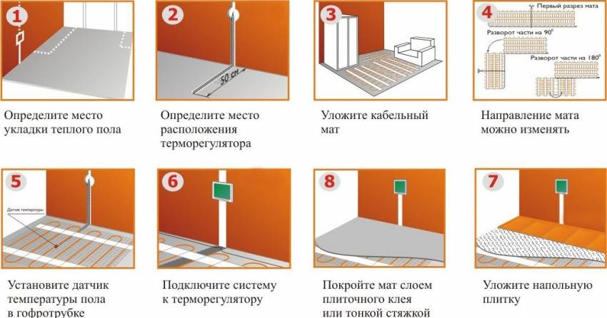 Устройство теплого пола своими руками в ванной комнате с применением нагревательных матов кабельного типа происходит по определенной схеме. Она подразумевает: